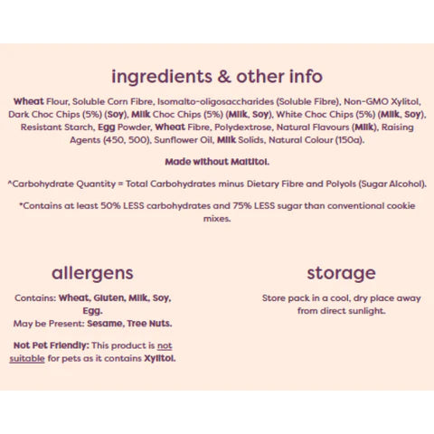 Ingredients: Wheat Flour, Soluble Corn Fibre, Isomalto-oligosaccharides (Soluble Fibre), Non-GMO Xylitol, Dark Choc Chips (5%) (Soy), Milk Choc Chips (5%) (Milk, Soy), White Choc Chips (5%) (Milk, Soy), Resistant Starch, Egg Powder, Wheat Fibre, Polydextrose, Natural Flavours (Milk), Raising Agents (450, 500), Sunflower Oil, Milk Solids, Natural Caramel Colour (150a).