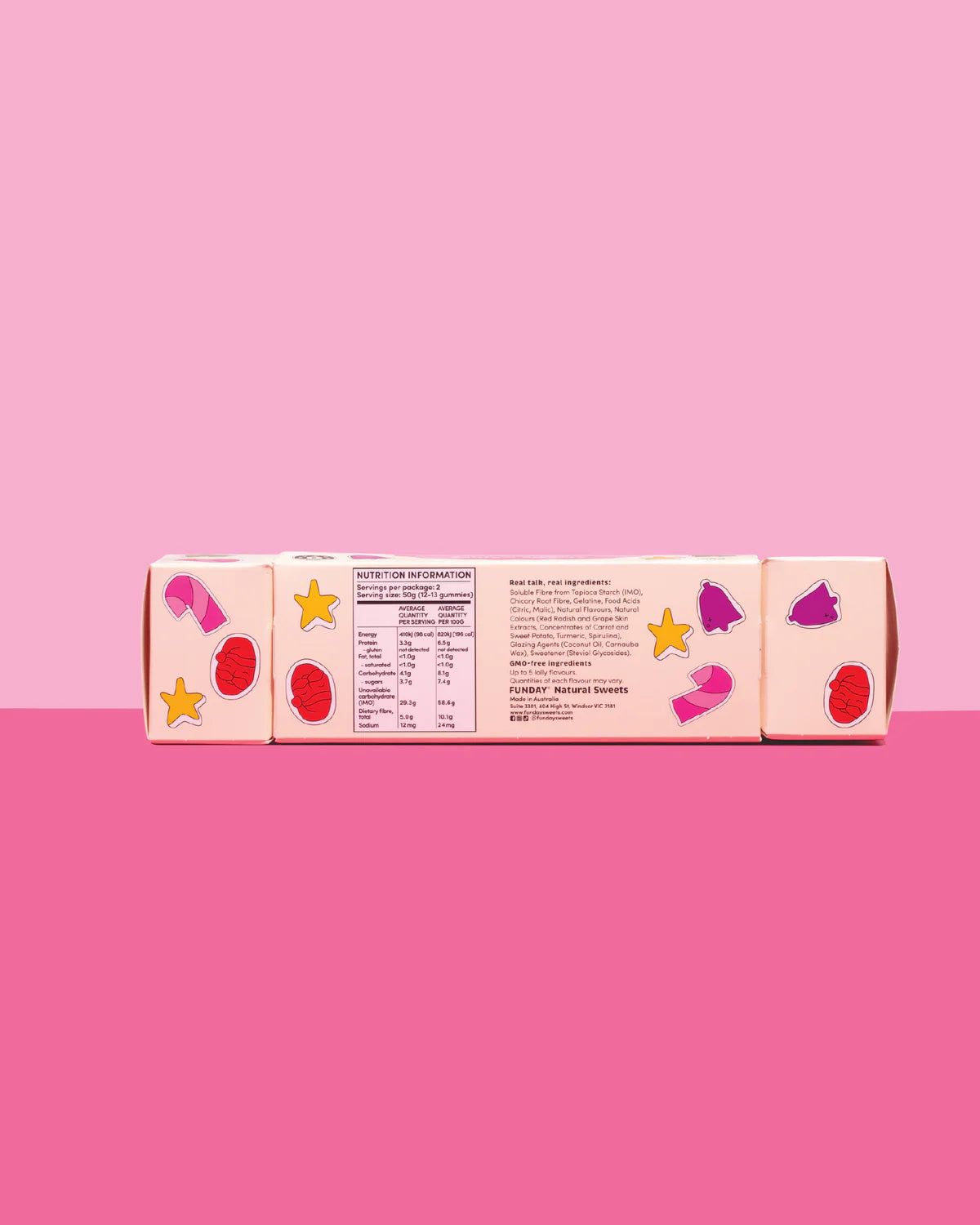 Ingredients: Soluble Fibre From Tapioca Starch (IMO), Chicory Root Fibre, Gelatine, Food Acids (Citric, Malic), Natural Flavour, Natural Colours (Red Radish, Grape Skin, Concerntrates of Carrot and Sweet Potato, Tumeric, Spirulina), Glazing Agent (Coconut oil, Carnauba Wax), Sweetener: Steviol Glycoside (Stevia).