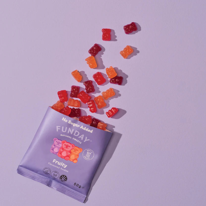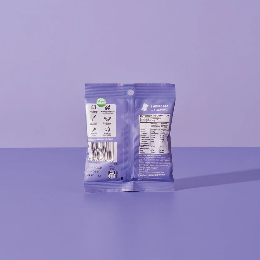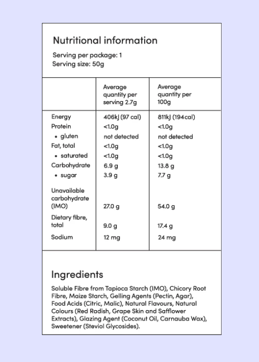 Ingredients: Soluble Fibre From Tapioca Starch (IMO), Chicory Root Fibre, Maize Starch, Gelling Agnets (Pectin, Agar), Food Acids (Citric, Malic), Natural Flavour, Natural Colours (Red Radish, Grape Skin and Safflower Extracts), Glazing Agent (Coconut oil, Carnauba Wax), Sweetener: Steviol Glycoside (Stevia).