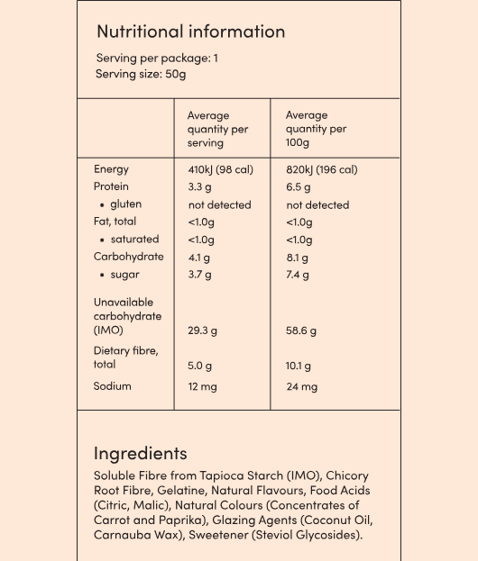 Ingredients: Soluble Fibre From Tapioca Starch (IMO), Chicory Root Fibre, Gelatine, Natural Flavours, Food Acids (Citric, Malic), Natural Colour (Concentrates of Carrot and Paprika), Glazing Agent (Coconut oil, Carnauba Wax), Sweetener: Steviol Glycoside (Stevia).