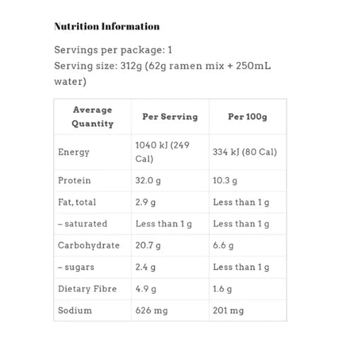 Ramen Noodles (89%) (Vital Wheat Gluten, Pea Protein, Wheat Flour, Buckwheat Flour, Pea Fibre, Tapioca Starch, Konjac Powder, Xanthan Gum, Sodium Carbonate, Salt), Seasoning (Maltodextrin, Salt, Sugar, Coconut Powder, Flavouring, Hydrolysed Vegetable Protein, Onion Powder, Chilli Powder, Garlic Powder, Yeast Extract, Spices (Curry Powder, Pepper), Silicon Dioxide), Vegetables (Onion, Carrot).