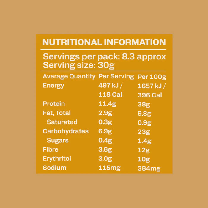 Ingredients: Soy Protein Isolate, Pea Concentrate, Erythritol, Canola oil, Soy lecithin, Inulin from chicory root, Peanut flour (2%), Stevia extract, Natural flavours (Peanut).
